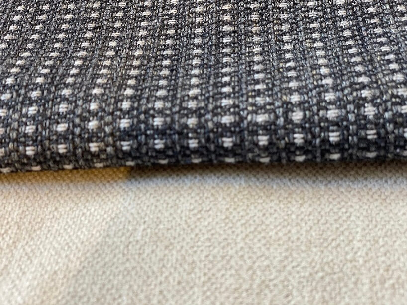 アクセントとなるクッションはF4-BK。シックなチャコールグレーの生地に太目のグレーの糸が印象的に織り込まれており、本体の生地との組み合わせで、大人っぽいモダンさがプラスされた組み合わせになりました。