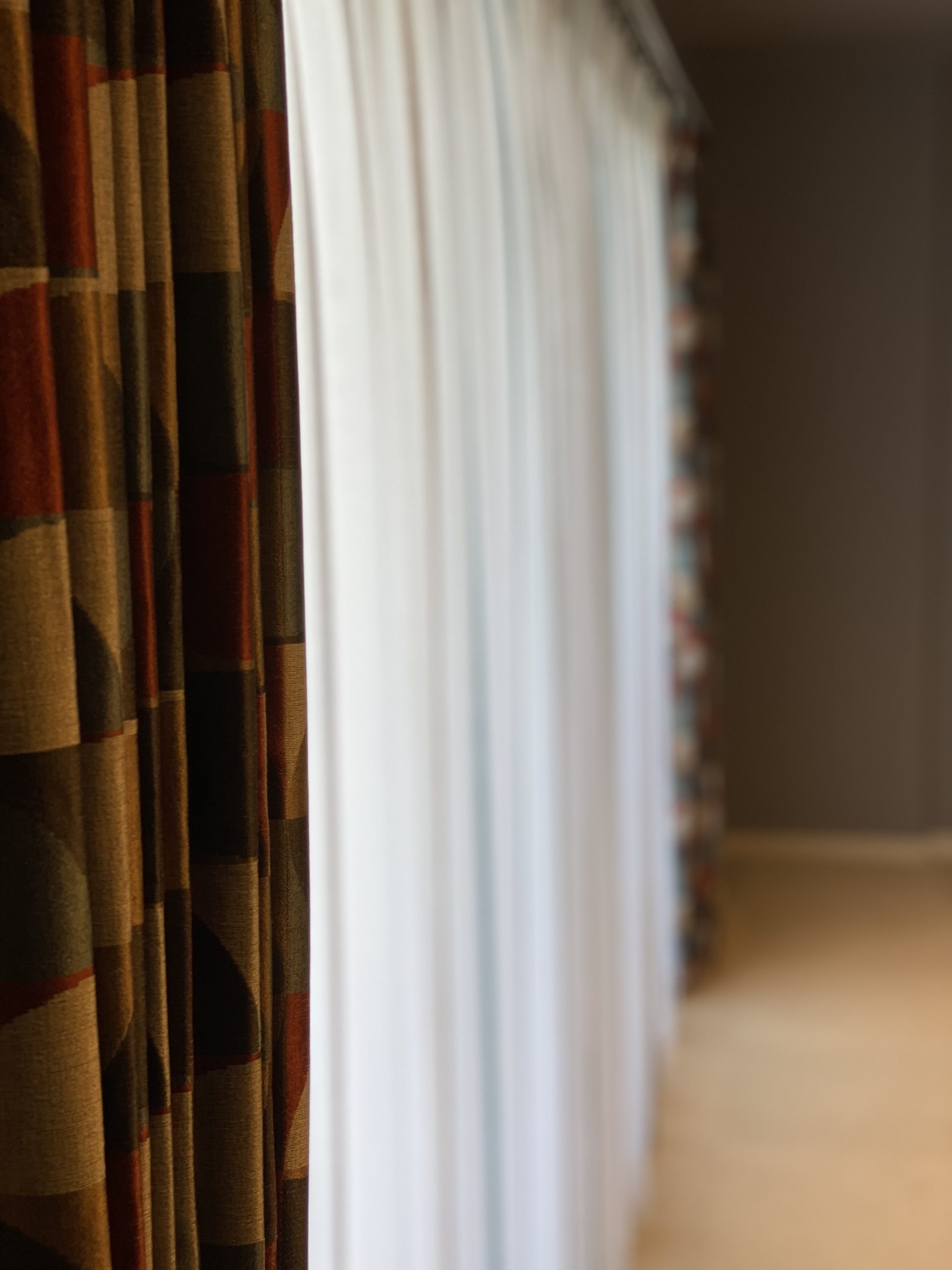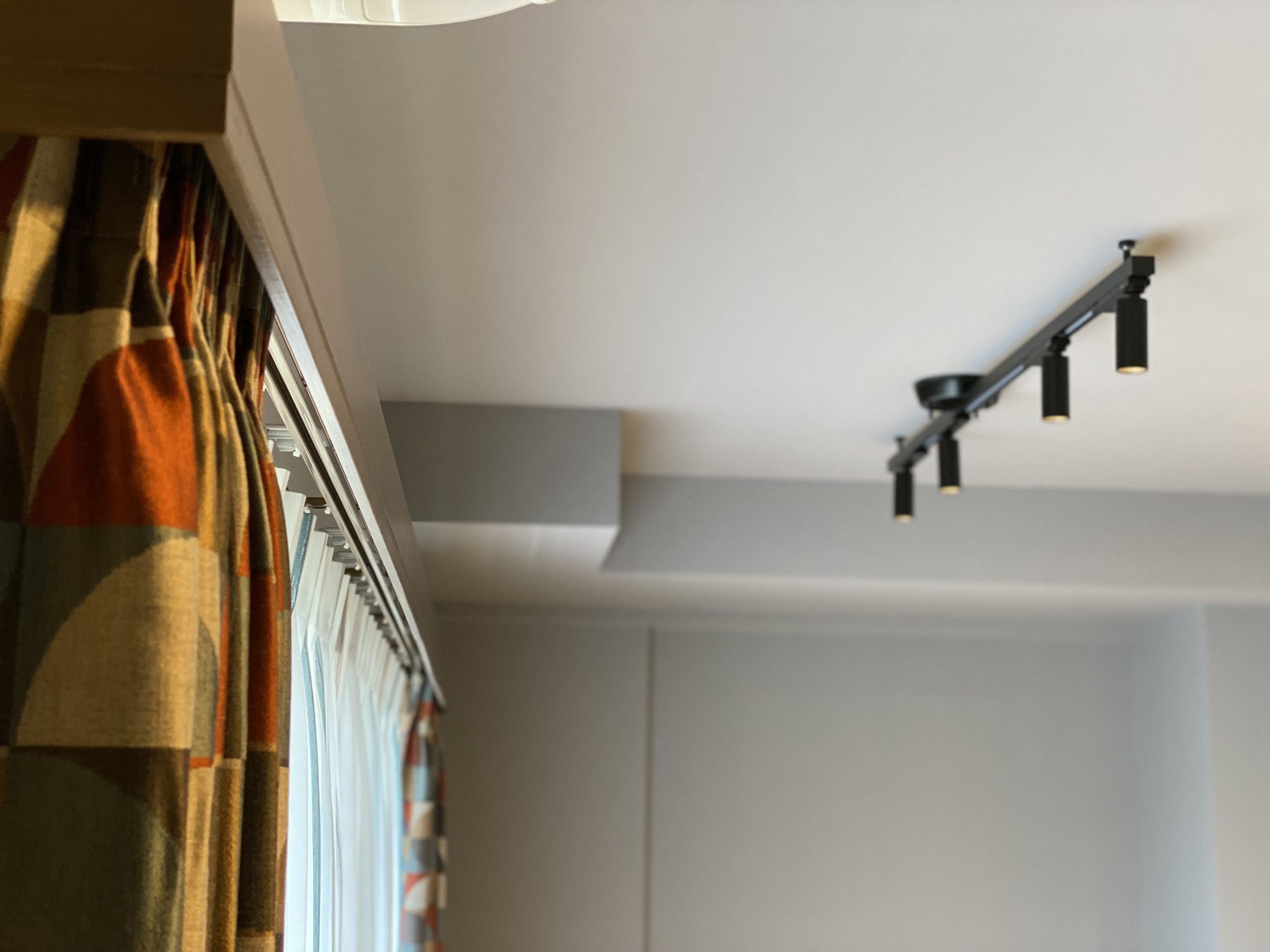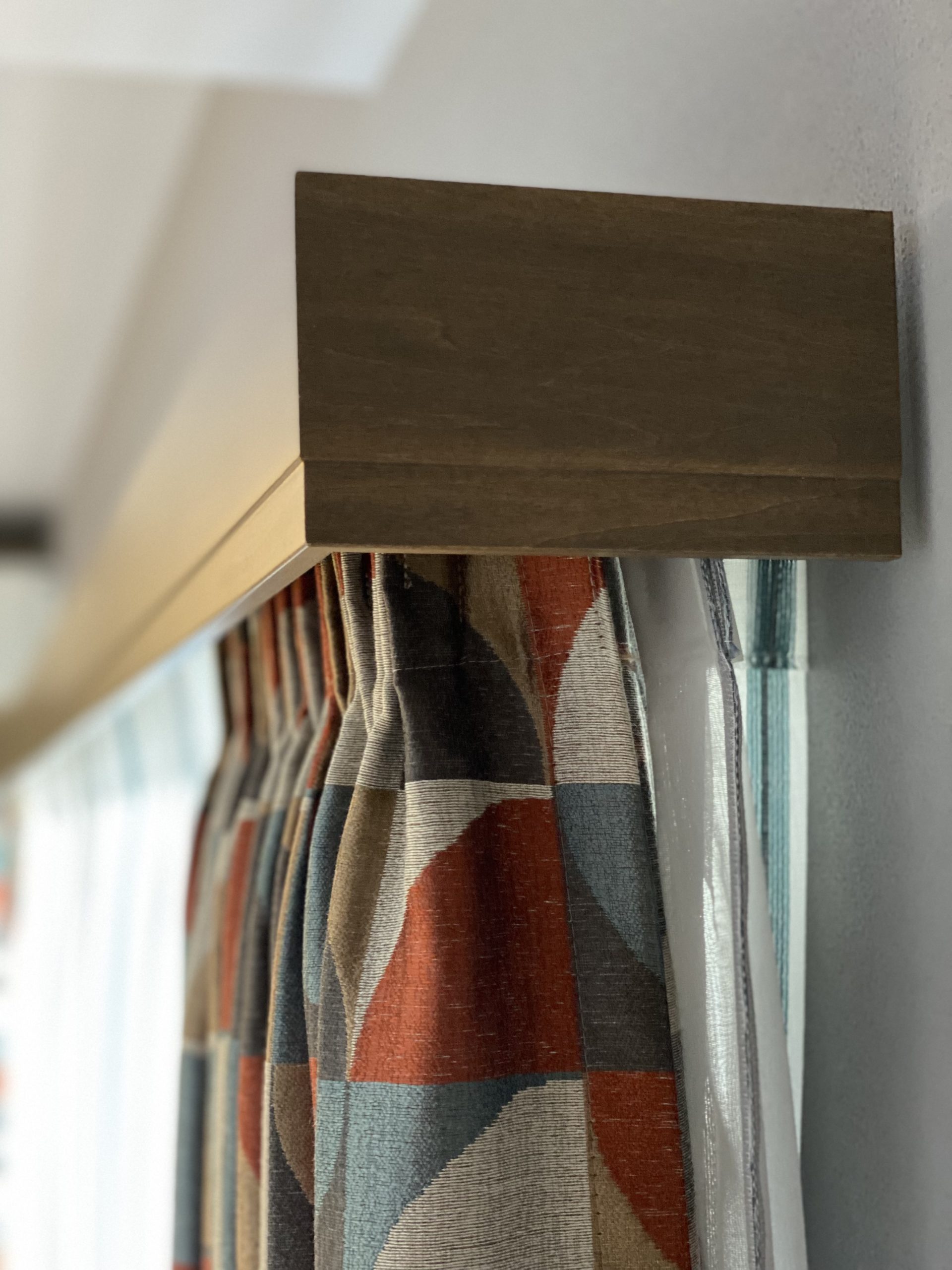 カーテンはお好きなミッドセンチュリーインテリアをより演出出来るカラフルなレトロな雰囲気の幾何学模様の生地をご提案しました。レースもシックで多色感が魅力的なブルーのストライプの柄なので、遊び心のある大人な組み合わせです。レールも既存の機能性レールからカーテンボックスタイプのレールへ交換することで、新調されるウォールナット材のダイニングセットとマッチし、クラシック感もプラスされた、よりレトロ感が強調されたコーディネートとなりました。
