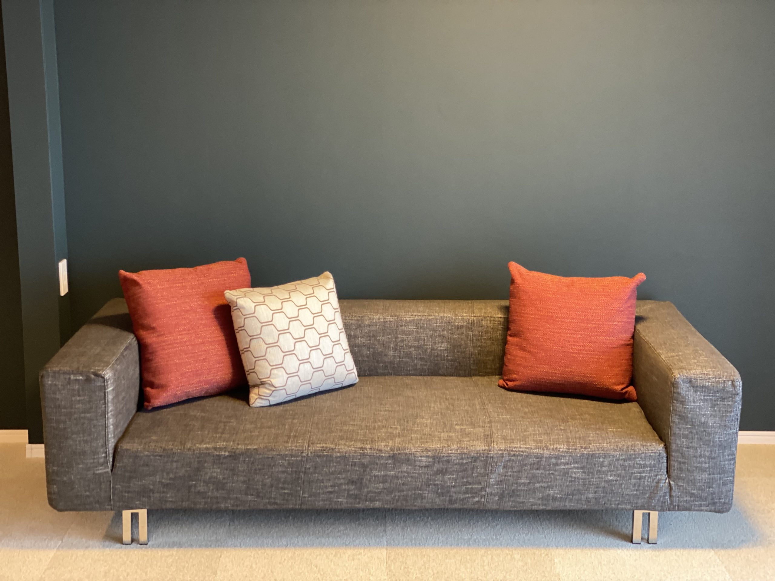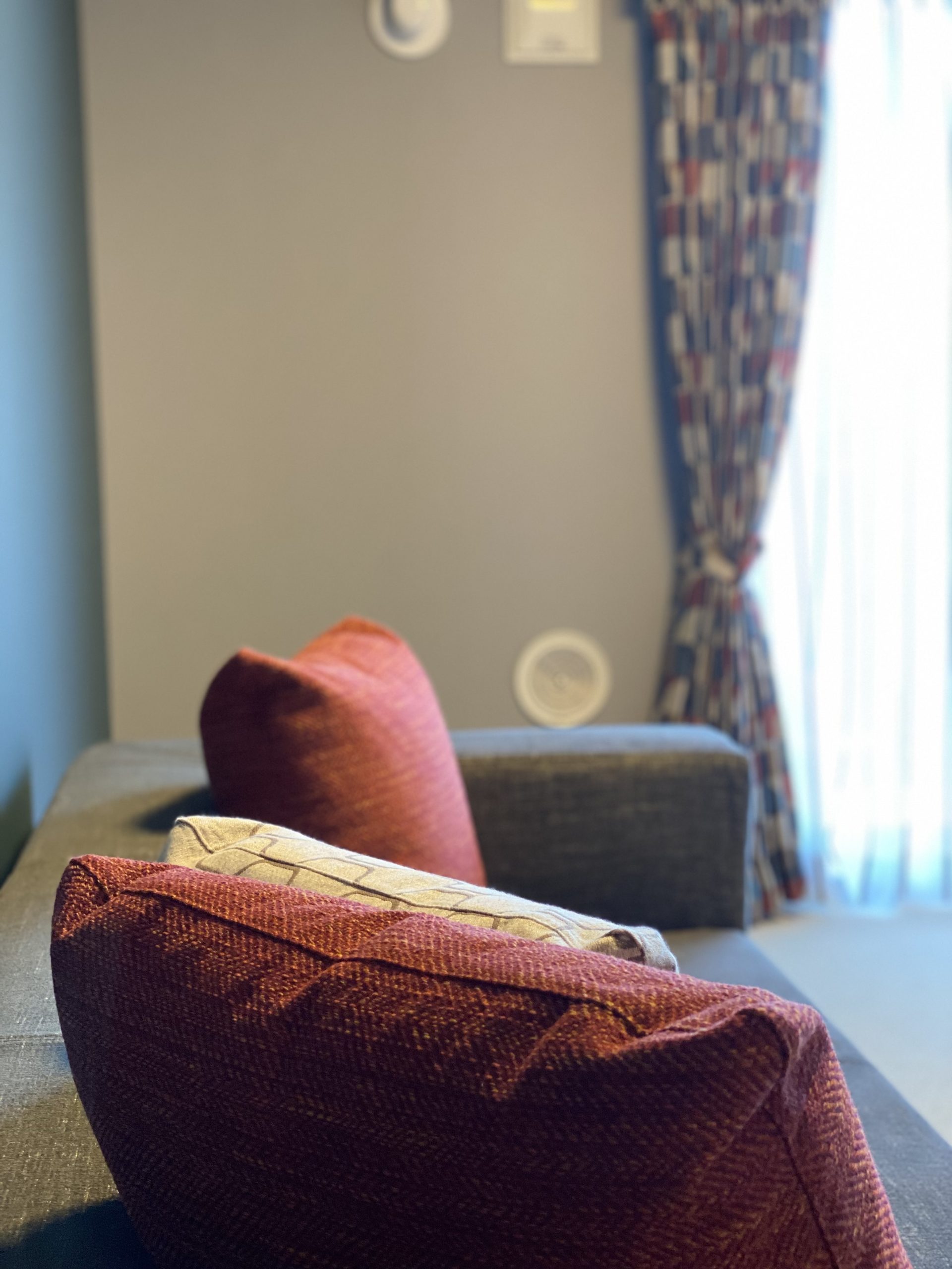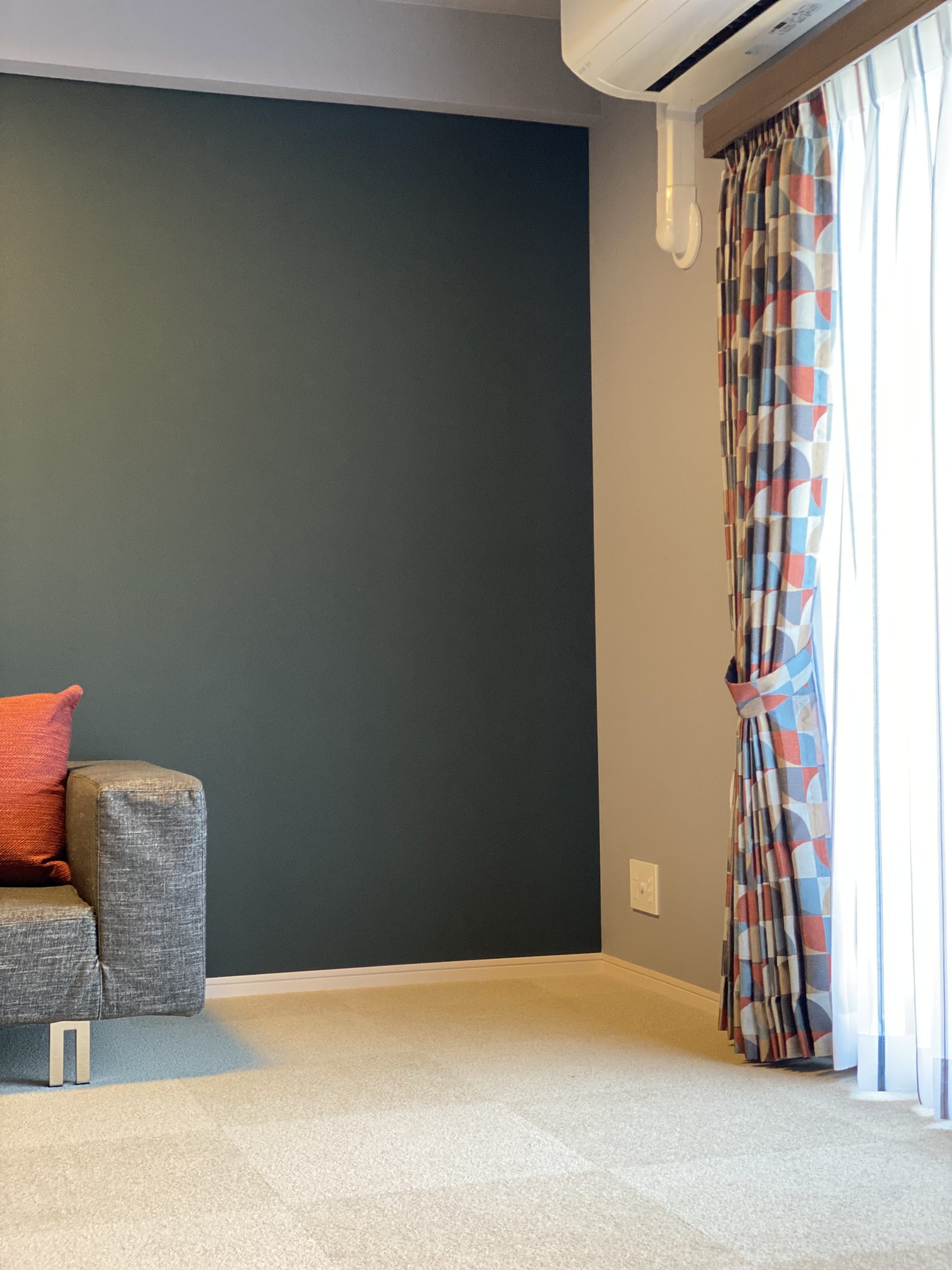 ソファは開放的に生まれ変わった空間を邪魔しない、全体がロータイプでフォルムも直積的でスッキリとしたデザインのものをご提案しました。ダークグリーンの壁紙との組み合わせも際立つグレーの本体生地に、アクセントクッションとカーテンとのカラーリングもマッチした組み合わせで、多色感が増す素敵なコーディネートになりました。