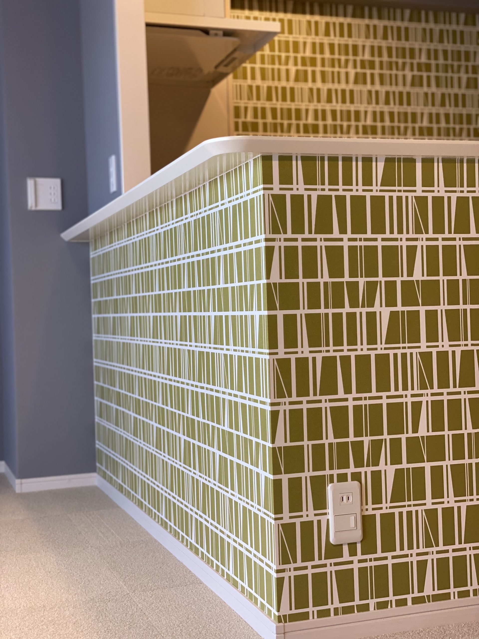 それに伴い、壁紙も新しく全面張替え。真っ白なシンプルな内装からイメージを一新しました。ベース壁や天井は、既存の建具との組み合わせも考慮しつつ、シックで落ち着いた空間となるように全面グレーで統一しました。アクセントとなる壁はリビング側とキッチン側の2箇所。リビング側には間仕切り壁を撤去したことで広がった壁に部屋のイメージを際立たせる深みのあるダークグリーンの壁紙。キッチン側にはグリーン系のカラーリングを配置しつつ、幾何学模様のモチーフがアクセントとなるミッドセンチュリー感もプラス出来る壁紙を選ばれました。床は既存フローリングからタイルカーペットへ全面張替えに。今回選んで頂いたような毛足がしっかりとある、クッション性の高いタイルカーペットは歩いた時の負担が少ないだけでなく、防音効果も期待できることが魅力です。また、汚れた範囲のみをすばやく交換でき、施工も簡単で継続的なメンテナンスがしやすいため、一緒に生活する猫ちゃんとも末永く快適に過ごせます。