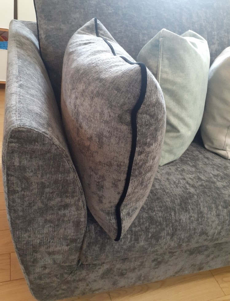 カバーファブリックには濃淡があり光の当たり具合で表情が変わるCUR-DG(ダークグレー)を本体・クッションに、上品で重厚感のあるベルベット生地のLRI-BK (ブラック)をパイピングにお選びいただきました。