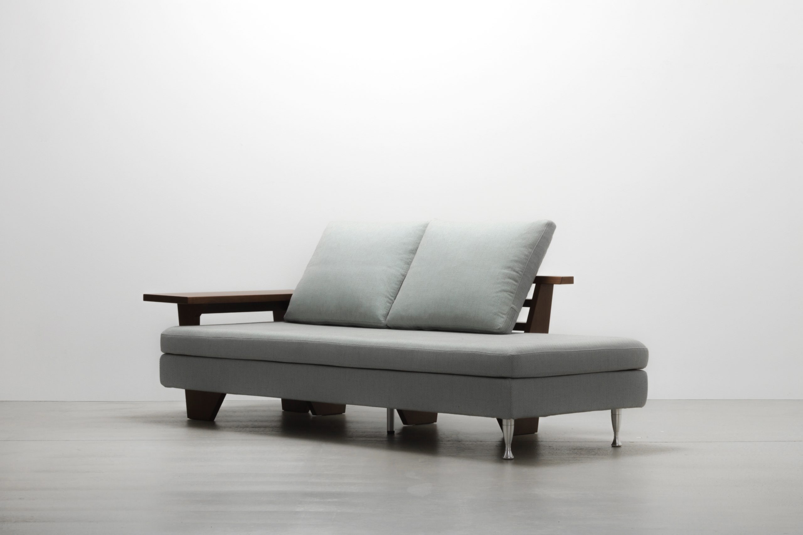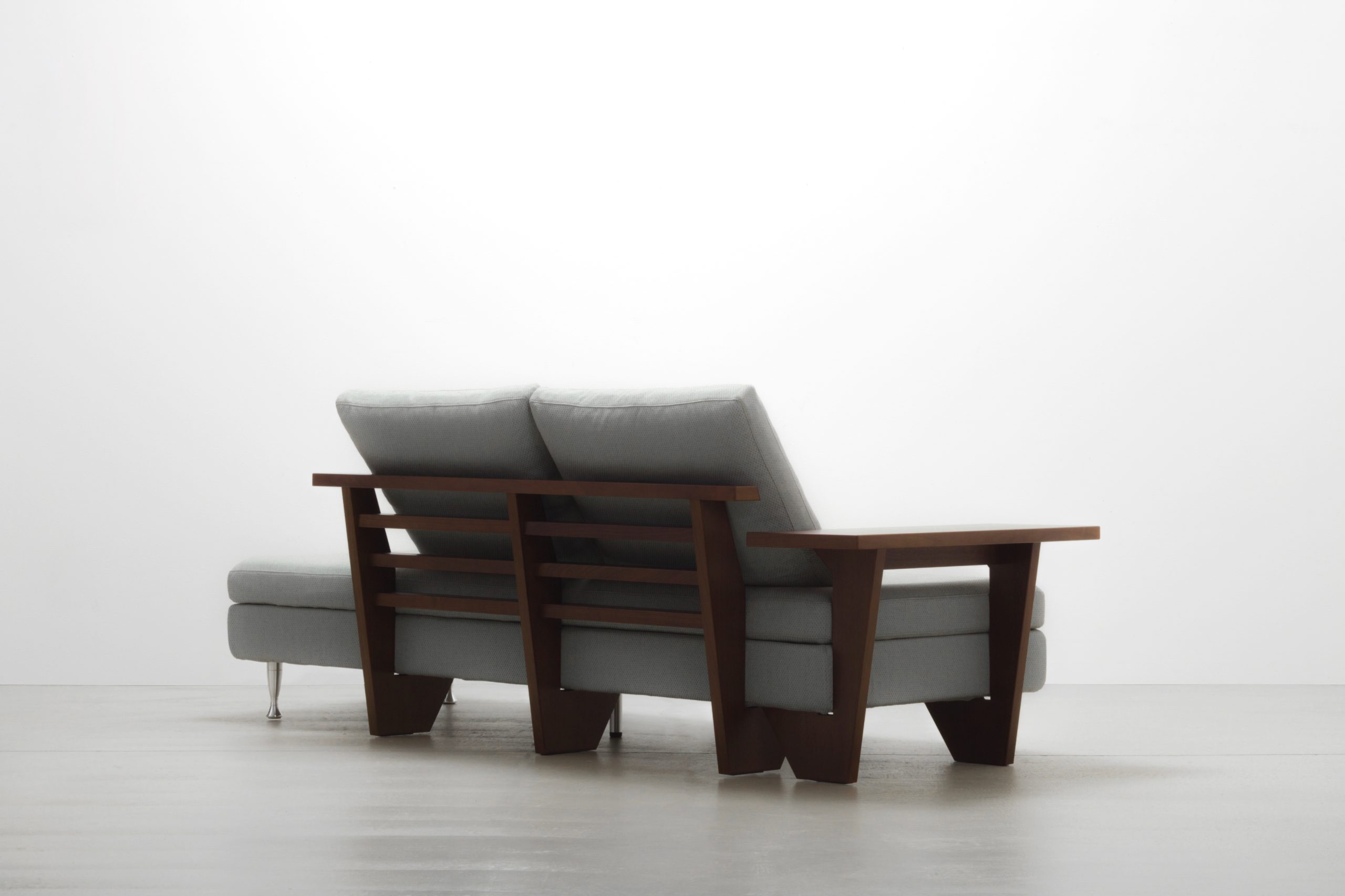 木のフレームに削り出しのジュラルミン脚がソファのアクセントになってます。フレームとアームは、お手入れしやすいウレタン塗装で仕上げた最高級突板を採用。カラーもお選びいただけます。