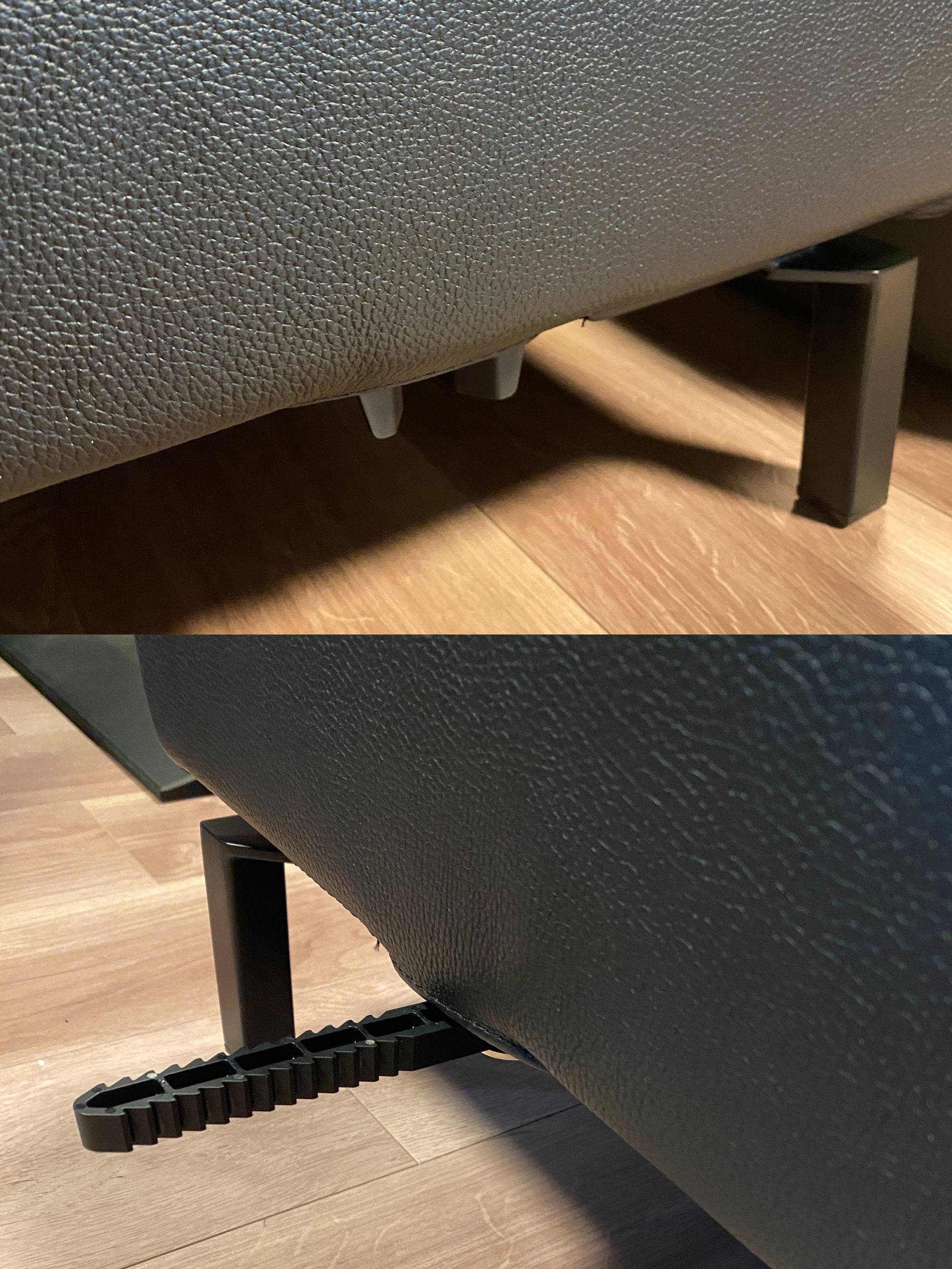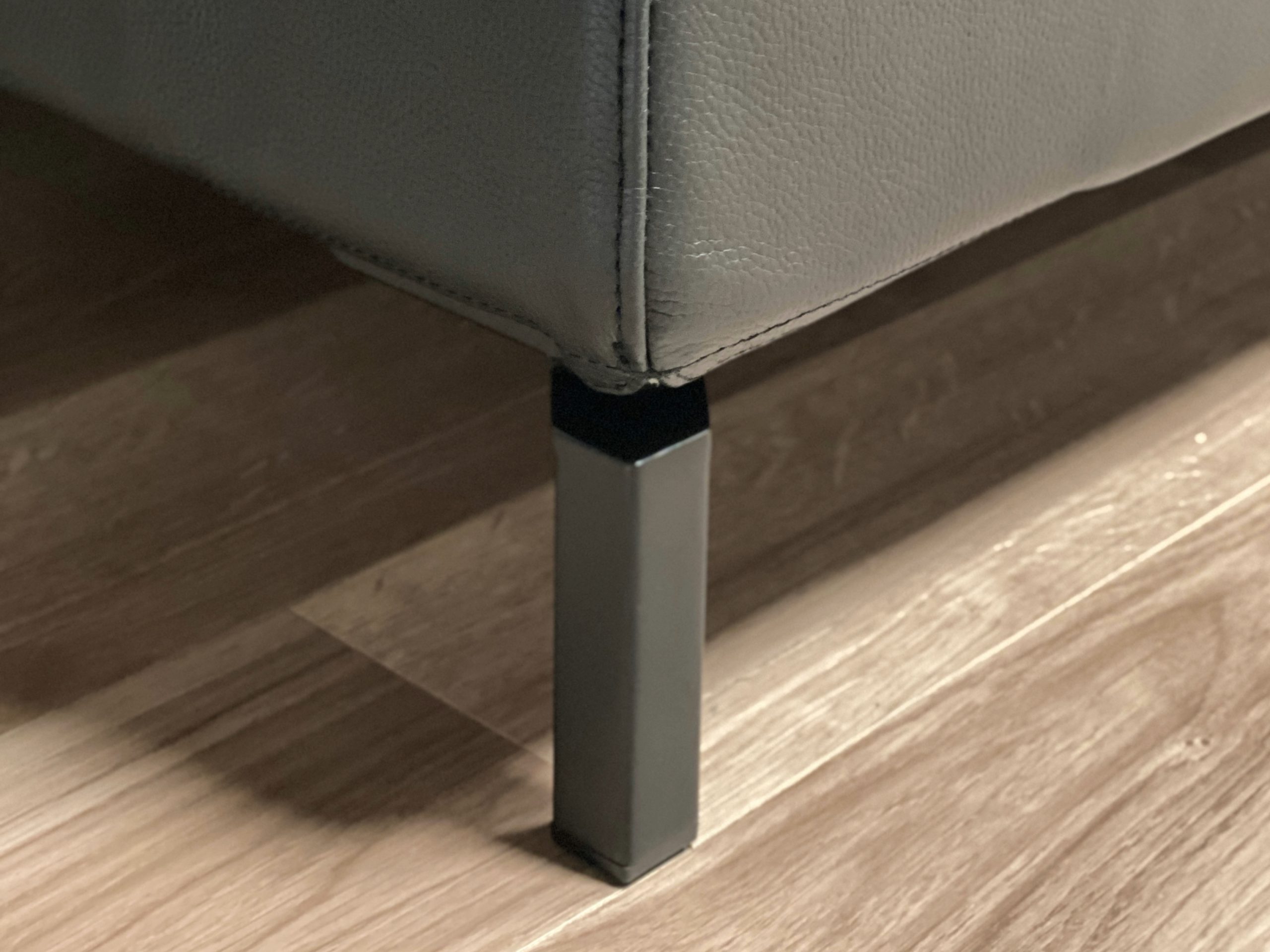 ジョイント式は、カウチセットの場合には標準仕様になっている連結仕様なのですが、1台1台で独立したソファをジョイント金具【2ヶ所】を使用して連結する仕様になります。受け側の金具は、本体裏の脚側より少し内側に2本下向きにシルバーの部品が設置される仕様ですが、離れて設置してもほとんど気になりませんし、差し込む側の金具は、折り畳んでソファ下へ収納することが可能です。1台1台が独立しても設置できるので、将来的なレイアウト変更にも対応可能です。連結する際には、カチカチカチと音をさせながらググっと押し込んでいくのですが、しっかり連結されていくので、ズレる心配がなく、ストレスフリーなので、より身体をしっかりと預けられ、安心して寛げるようになります。