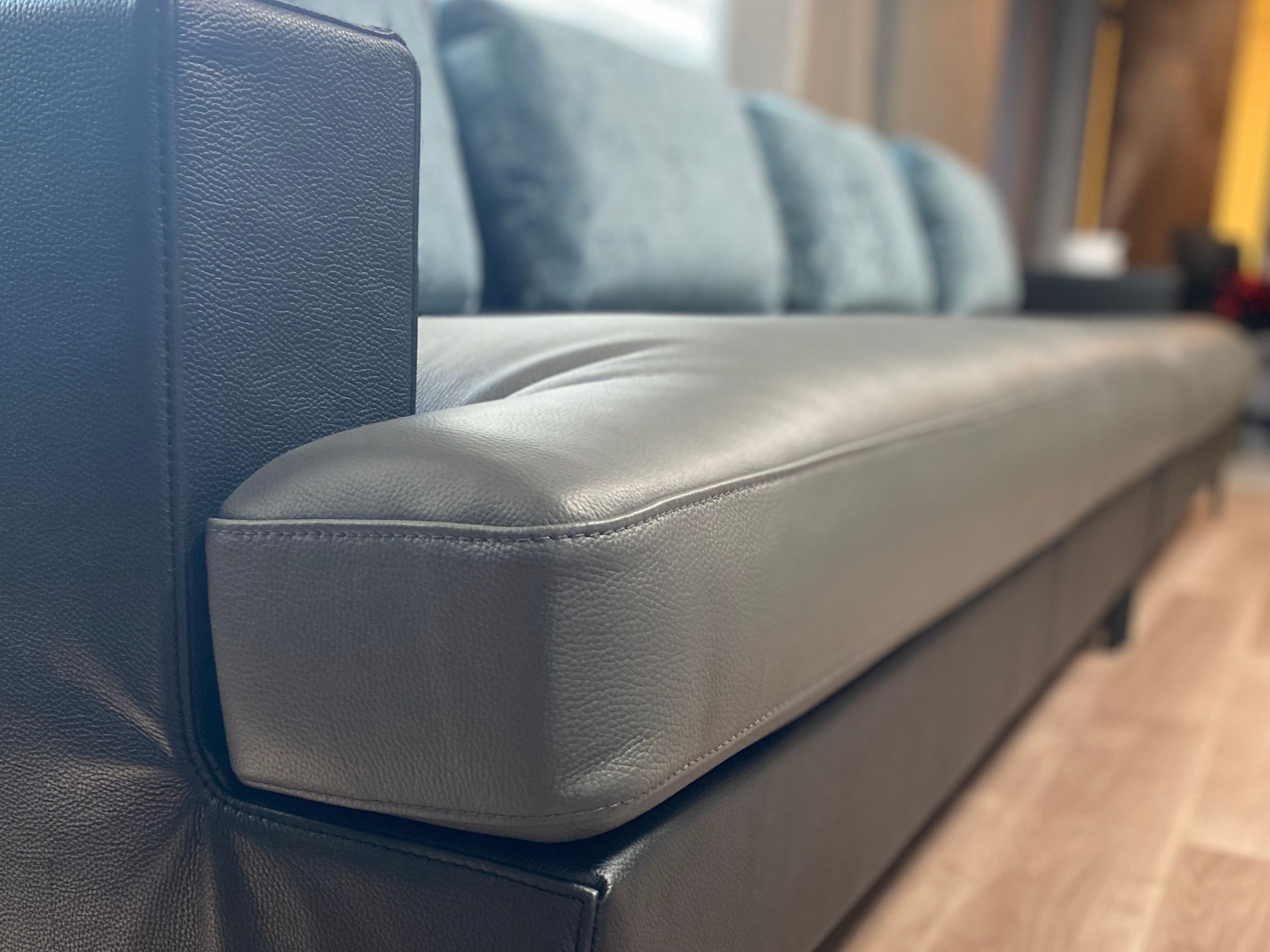 今回選ばれた本革は、エンボス加工を施されたLEエンボスシリーズになります。牛皮の模様をあえてくっきりとプレスしたエンボス加工の仕上げと、表面は摩擦・日光・水分といった刺激から革を守るための顔料で塗装されているので、エンボス加工+顔料塗装の組合せで、革本来の傷やムラが目立ちにくくなっております。お客様の希望もあり、本体とクッション部分は、本革LEエンボスシリーズのグレー・ブラック2色のグラデーションカラーで張り分けをさせて頂きました。そこに当初よりイメージされていたブルーがより印象的なアクセントになればと、上品な起毛が美しいCURシリーズから、BG(ブルーグレー)でSクッションをご提案し、採用して頂きました。色違いのDG(ダークグレー)のボルスタークッションも加わり、シックなコントラストが印象的な大人カラーリングでまとまりました。