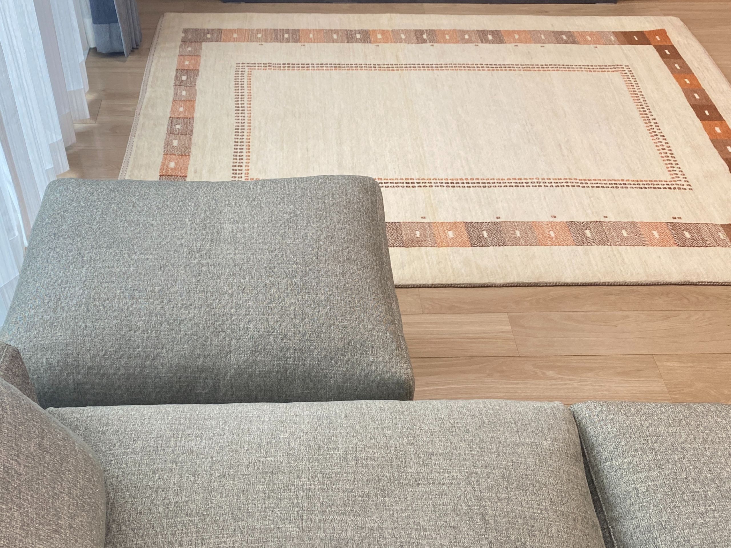 上品なブラウン系のカラーリングでシンプルモダンな幾何学柄のギャッベが、今回の主役となるグレーソファを程よく引き立てます。全体的にはクールな印象のグレージュインテリアになっておりますが、手織り絨毯であるギャッベの上質さや柔らかさが加わることで、壁面のベージュ系のエコカラットやTV台の重厚なセラミック柄をより印象的に見せてくれているように思います。Y様ありがとうございました。